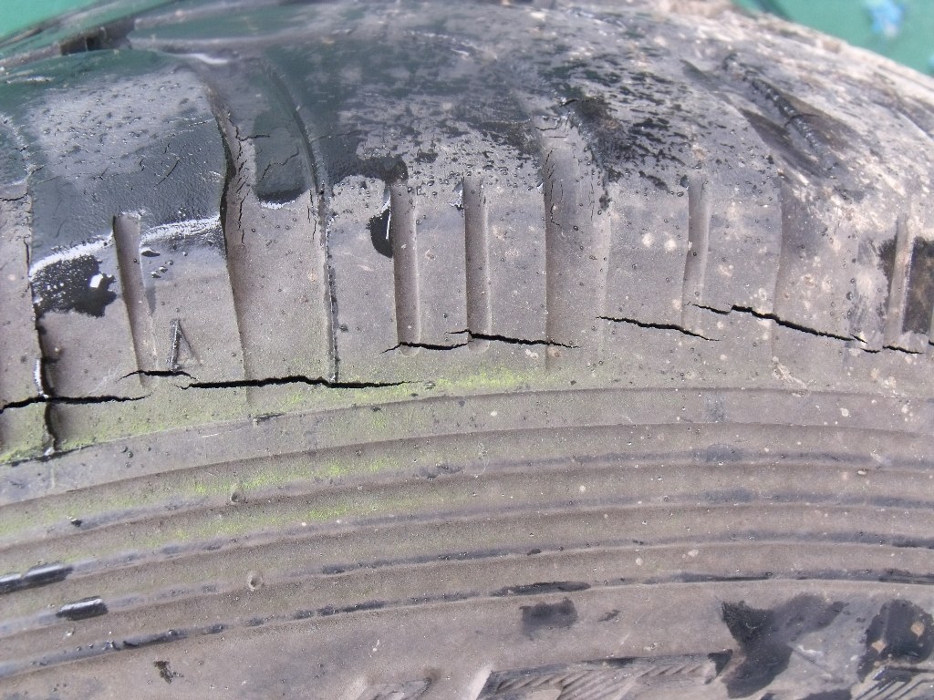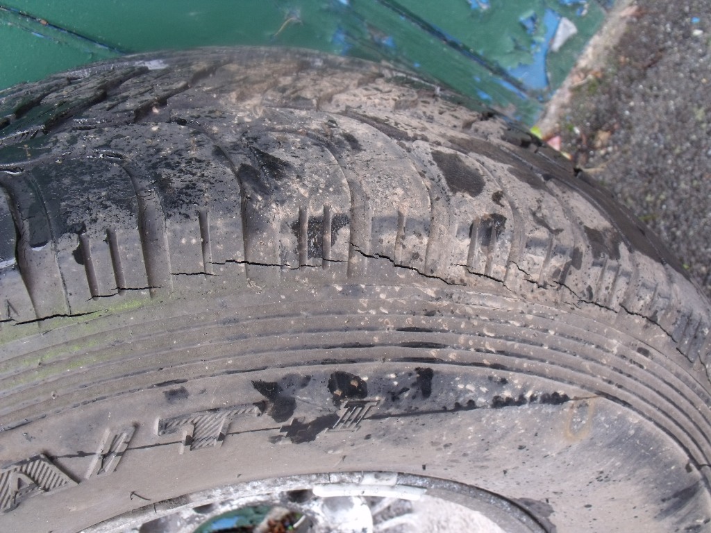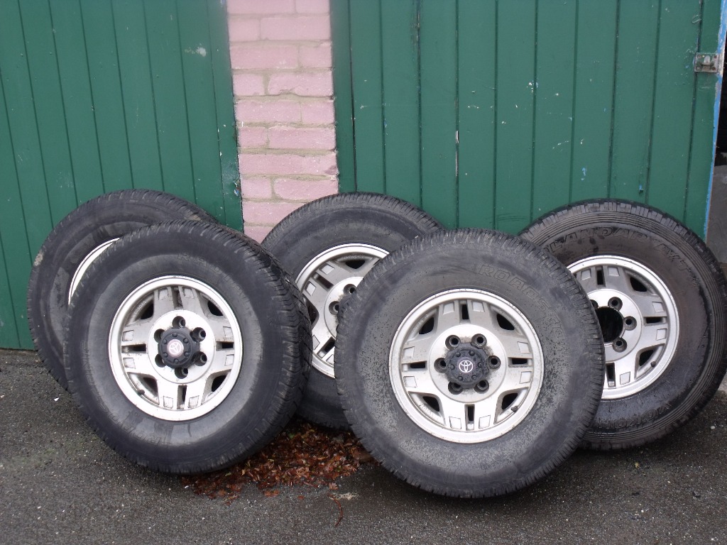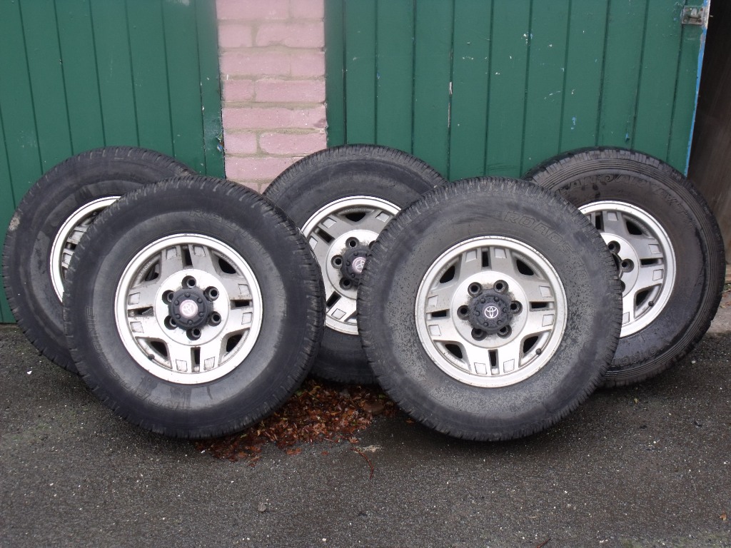 There are five 15" original alloy wheels. Four of them are shod with 265/70/R15/110T Roadstone Radial tres on them. Not a right lot of tread on them tbh but still above the legal limit. The spare has been the spare since God was in short trousers i think. There is some cracking along the side walls so this is probably good for nowt. Just for general information it's shod with a Yokohoma Geolander, same size as above.