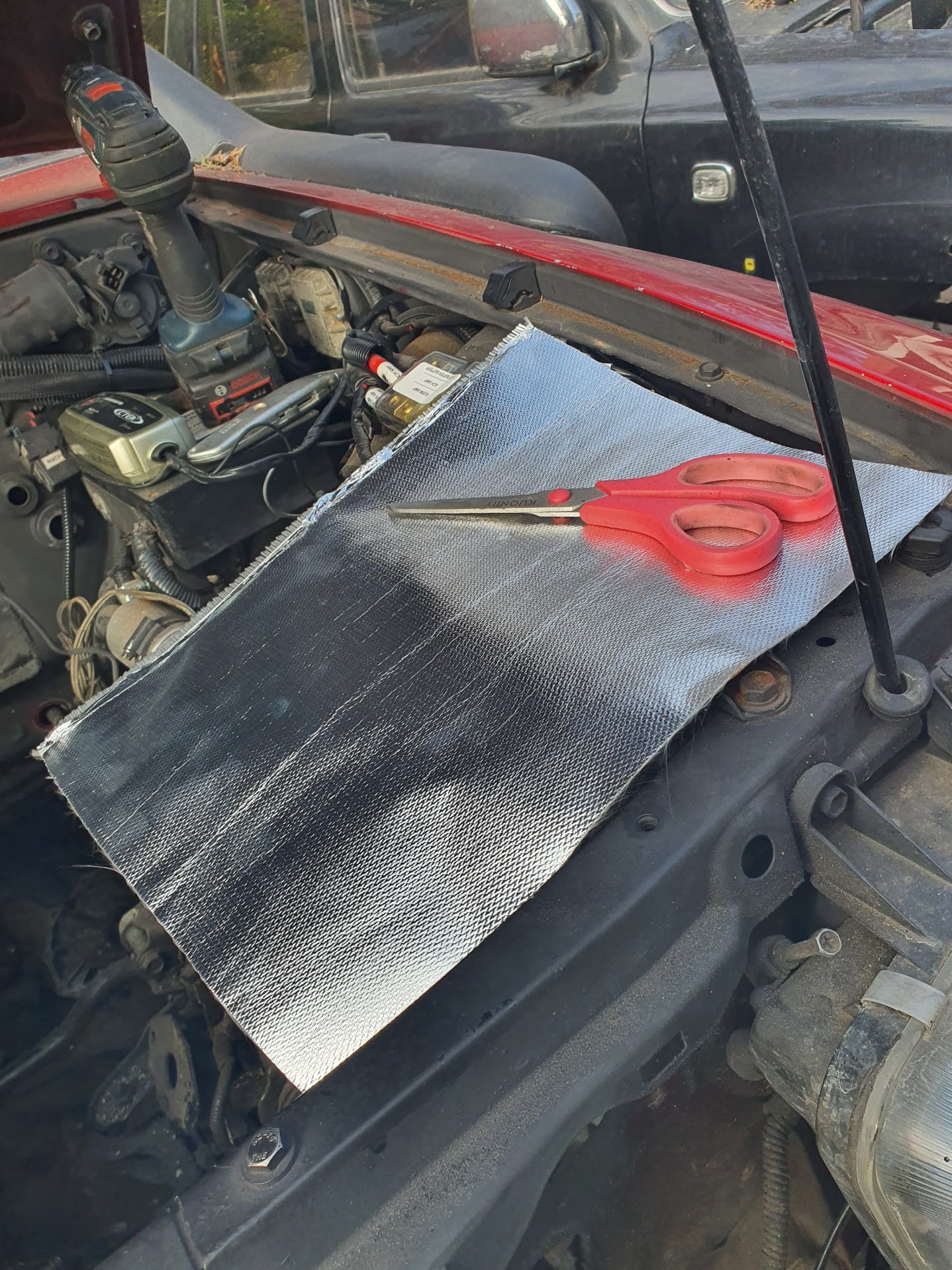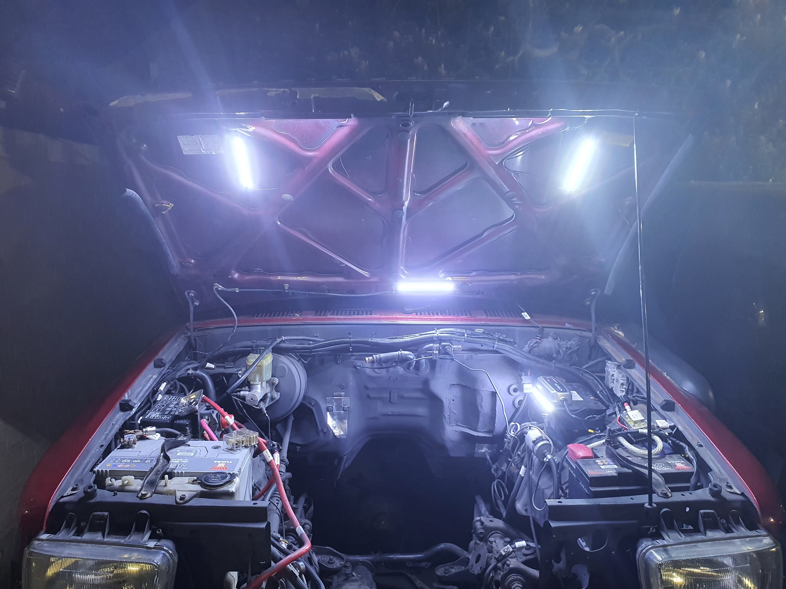 I've added 12v LED lights under the bonnet which turn on automatically when you open the bonnet and light everything up. They run off my leisure battery (I have a proper 2 battery split charge setup) and are really bright.