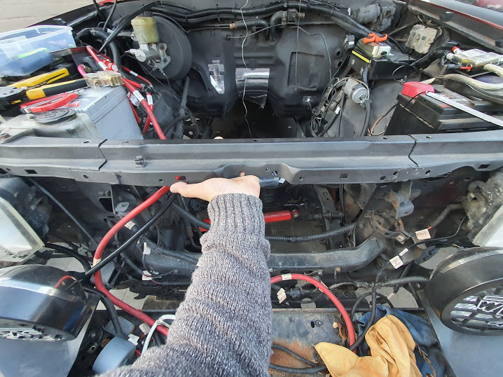 The grills etc all had to be removed, and we had to cut a piece out of the front (the bit that the radiator and grill attaches to) to be able to get the 1UZ out. I'll later modify that so it can be simply bolted back in.