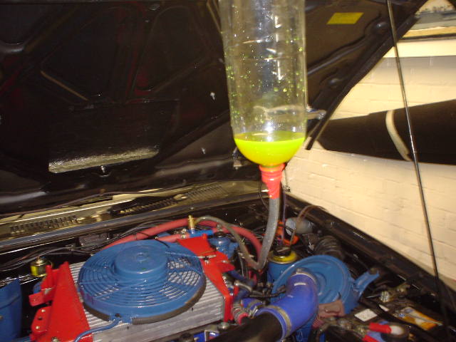 I burped! the cooling system today, let it run up to temp with this attached and waited for the bubbles to stop, apart from my finger slipping off the end and pouring coolant all over the intercooler it all went well,