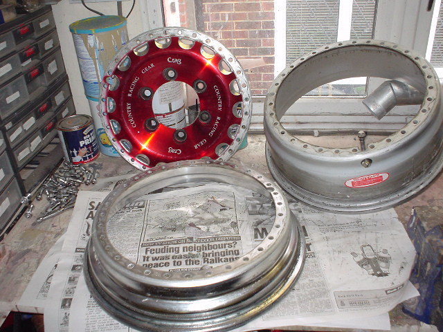 OK Carl what i did was get the tyres taken off and undo all the bolts around the split rim, then after polishing or if you want painting em just re fit together with what used to be the back rim fitted at the front, as ya can see it made the wheels stick out further than when standard, when reassembling