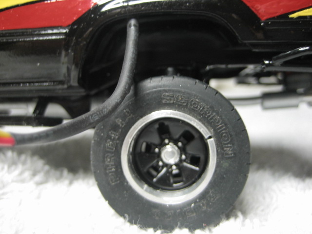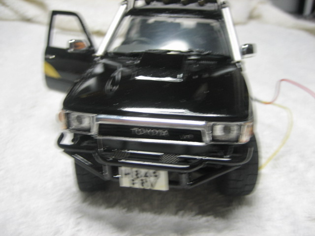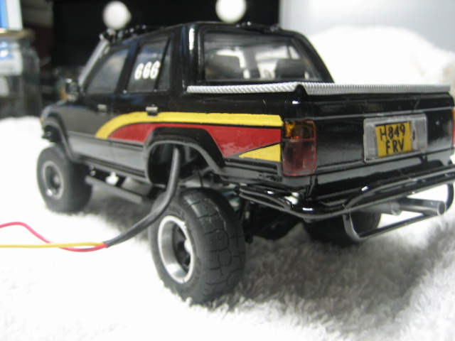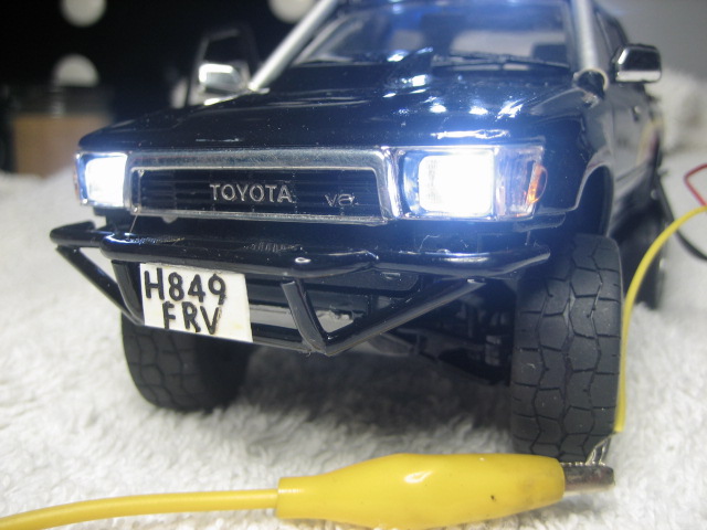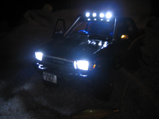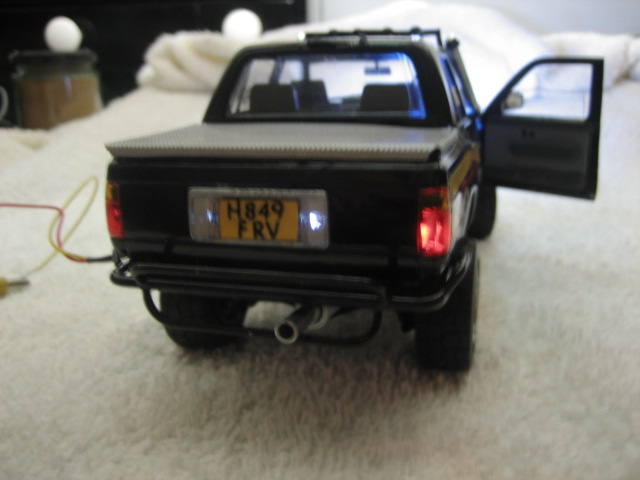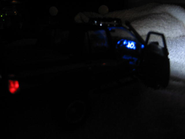 Thats about it apart from some mud when its ready for it's setting, been fiddley and main prob was buggering up the spray job, not an exact copy (dont think stien had blue dash lights but could'nt resist it! plus i buggered up the gauges decal) i'll drop the wires down through the setting baseboard so it wont be so obvious, rims and tyres aint quite pukka but best i could do,