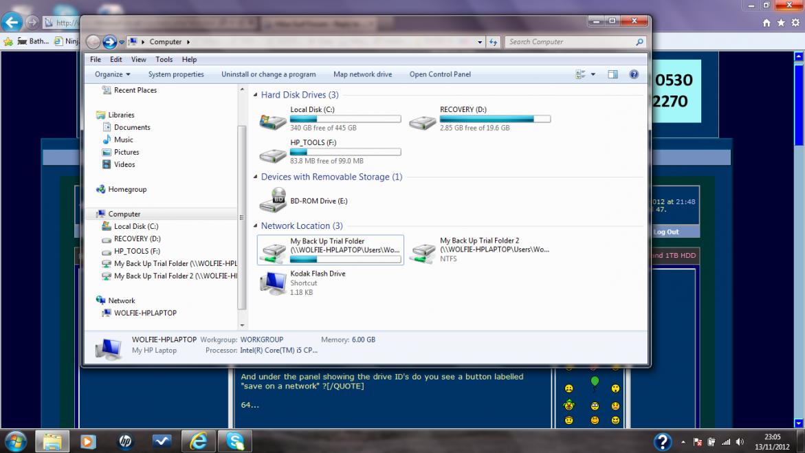 What I can't get is Windows "Back Up" program to see the 2 drives - there is no way of entering info as available destinations for back up, as they appear on a drop down list. Thing is the only one on that list is INTERNAL, so I f I lose the laptop I'm bu*gered.