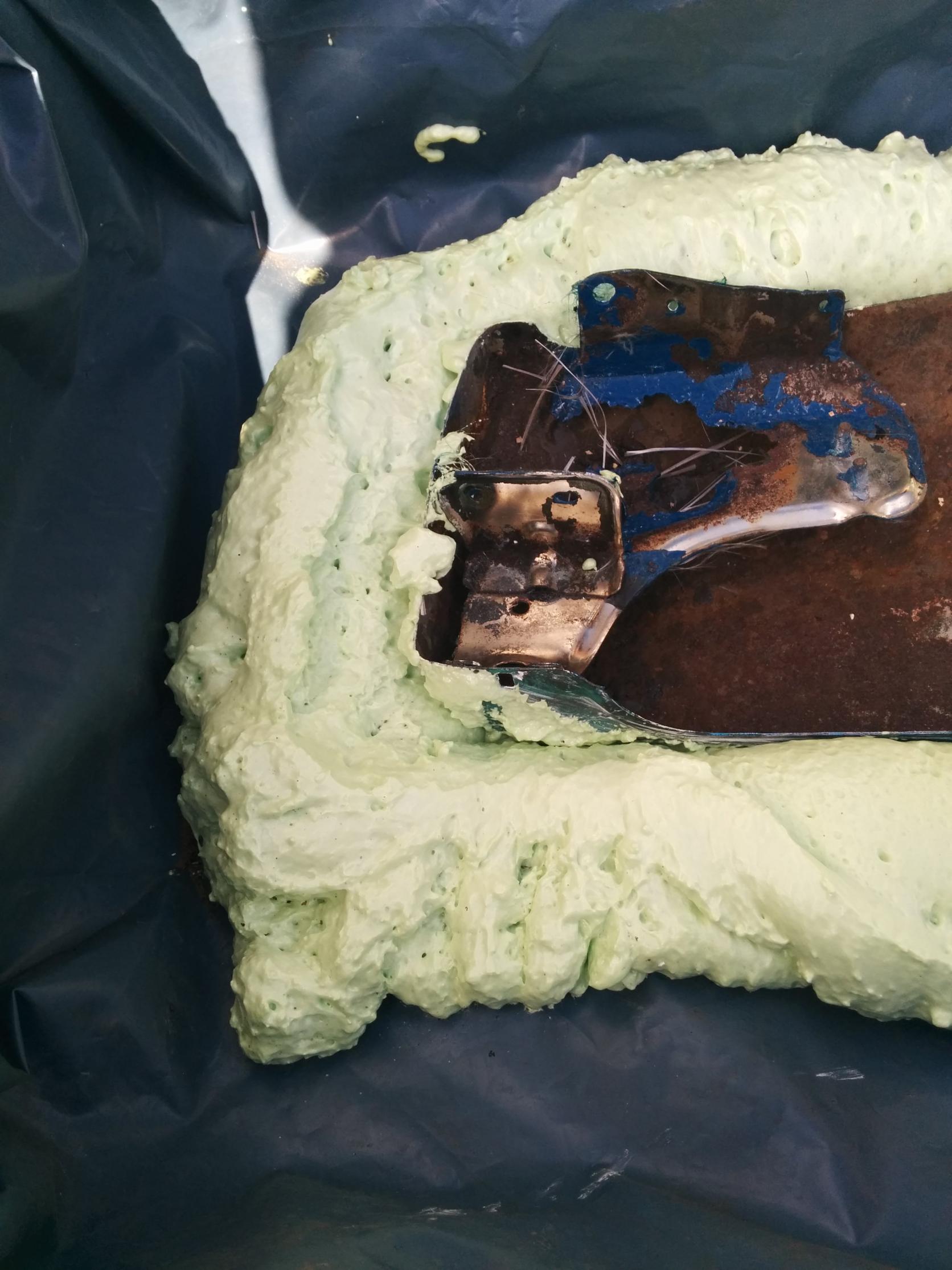 Definately going to have to make a frame to contain the foam and part...as it expands it falls away from the bumper since it can't stick due to the mould release wax..so good, in that the wax might work! but bad as it won't hold a shape "free form". The low expansion foam in a can is no good either, just not enough of it and it doesn't expand enough to really get good coverage.