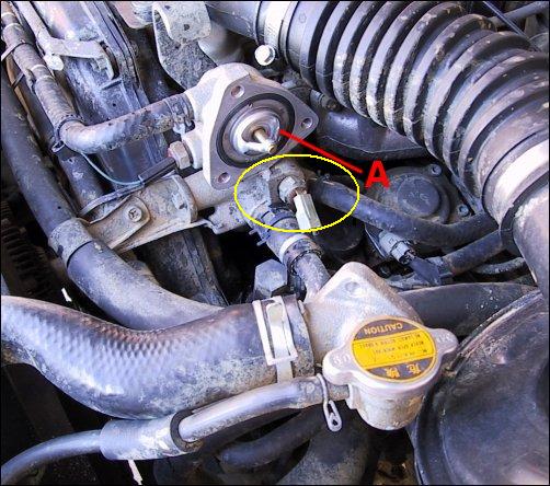 Nope. Wrong one. That's for the Temp Gauge. This is the one that supplies info to the ECU and give the fault code.Originally posted by BUSHWHACKERHere is a pic of the thermostat, the temperature sender is the one circled in yellow.