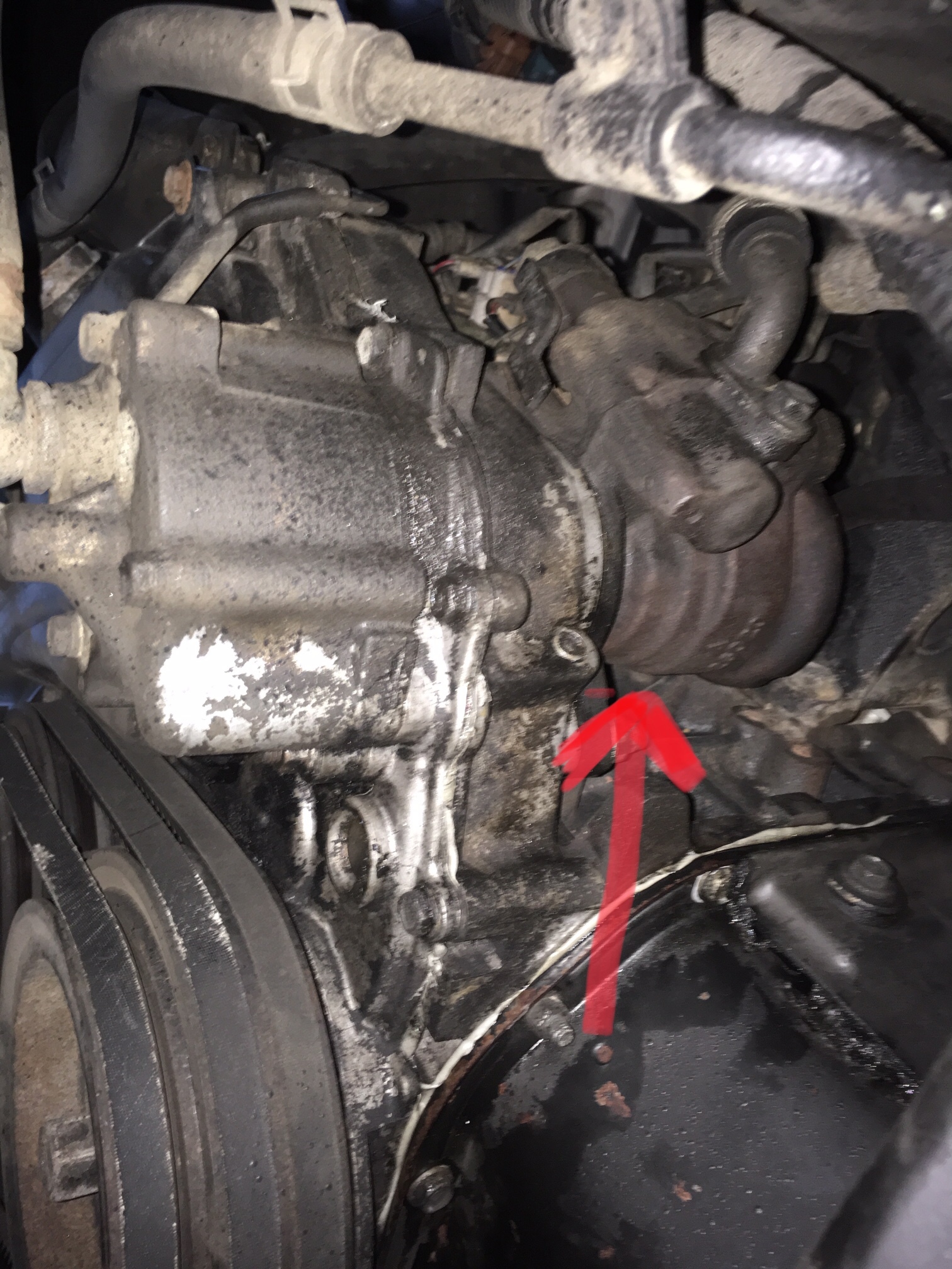 I would think the second picture taken from underneath, bottom pulley on the left, sump in view. Power steering pump?