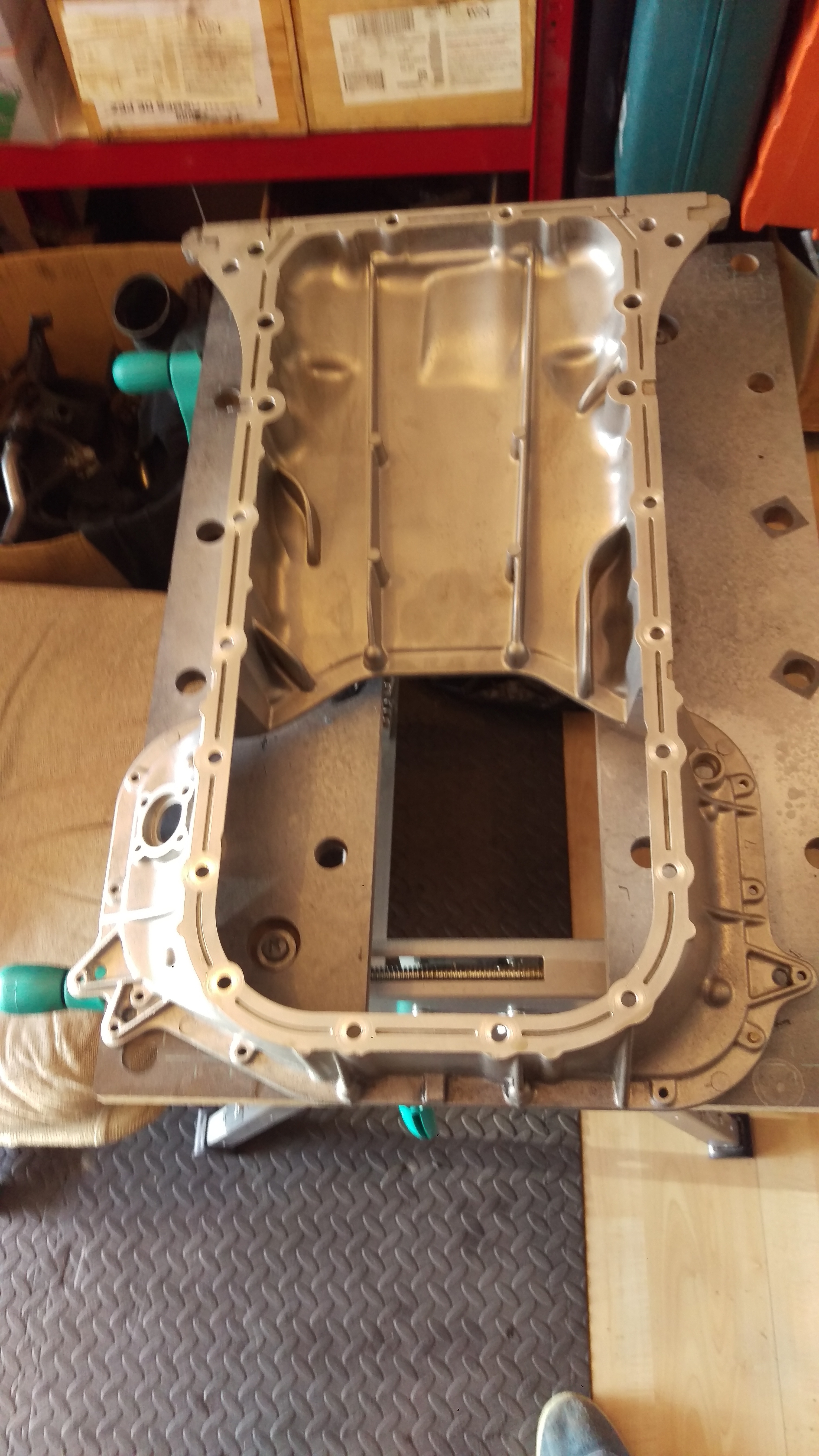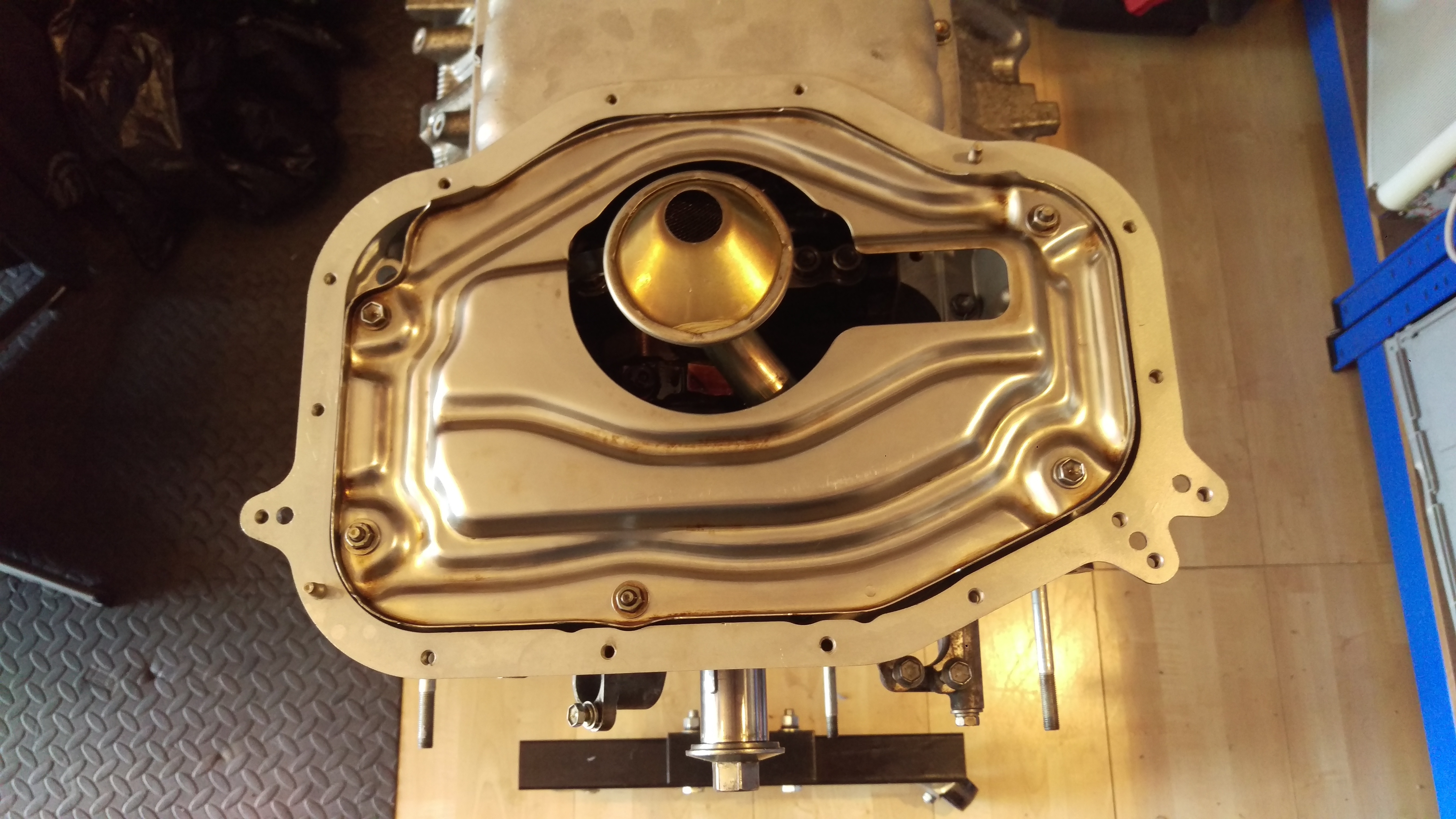 Sealed the sump flange with some extremely sticky Loctite goo that I hope will do the job. The Oil Pump Pick-Up Pipe with new gasket, baffle plate, lower sump gasket and finally the lower sump itself.