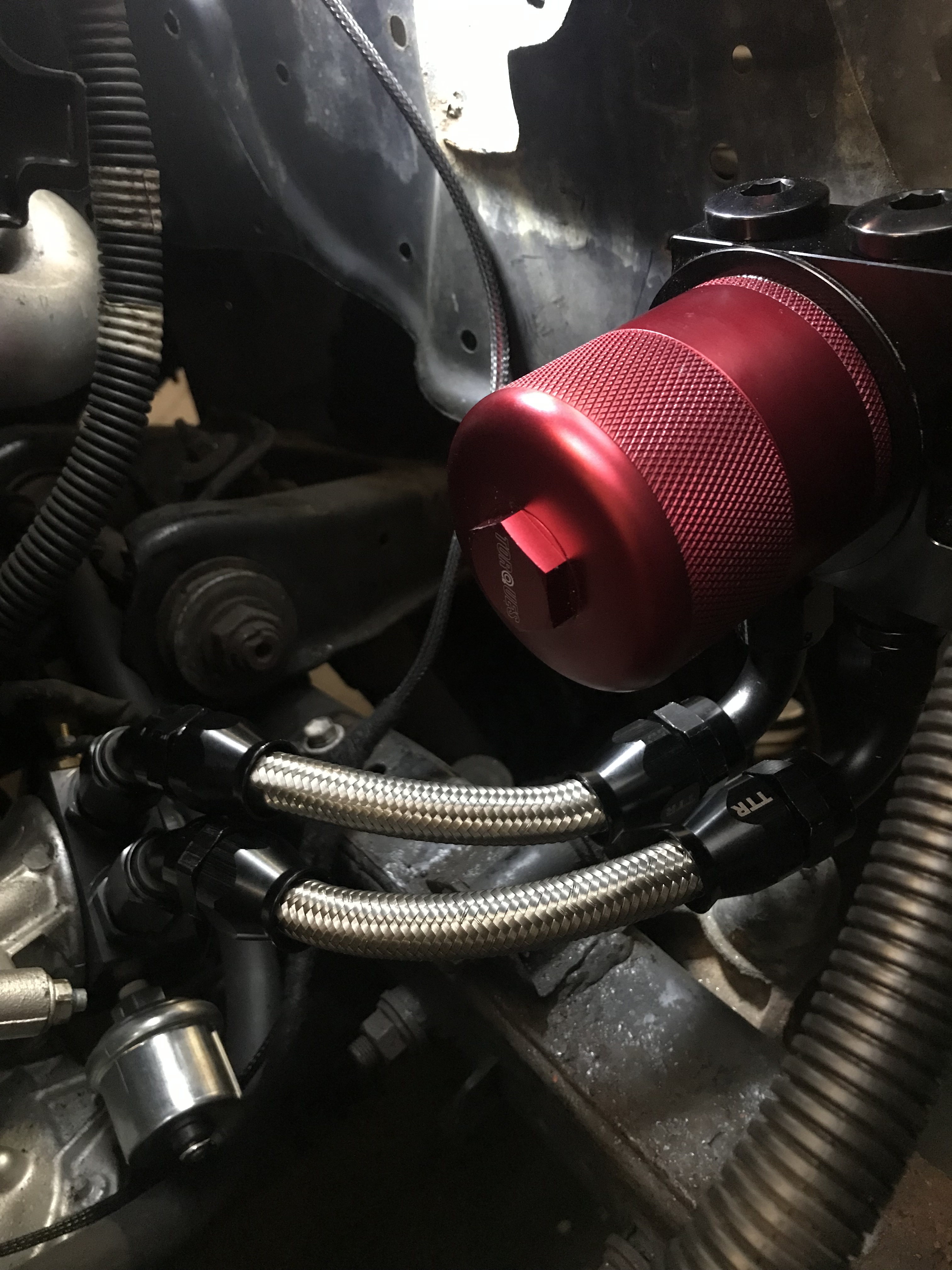 Well it’s been a tough slog. Engine is in its final resting place, Walbro fuel pump is in the tank and refitted along with new fuel filter and AN-6 fittings. Oil relocation is fitted with new oil pressure and temp sensors. Loom is all fitted and shoved through the firewall. Gear linkage shortened and props refitted.
