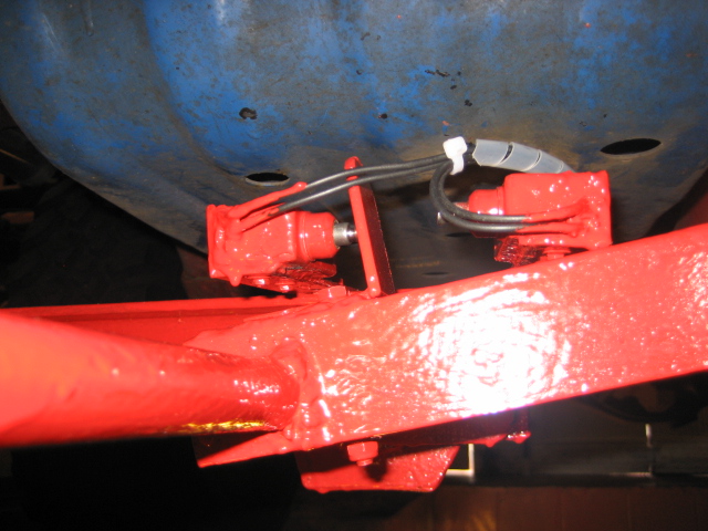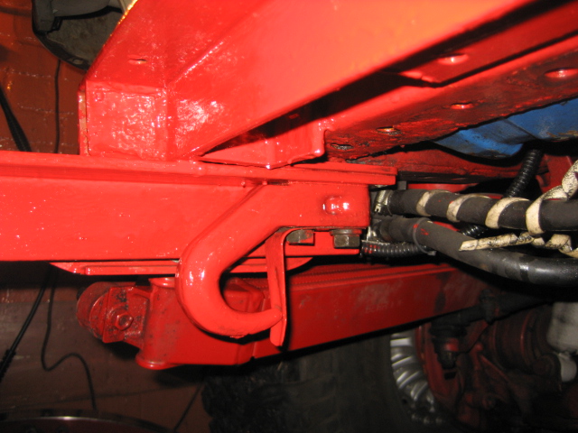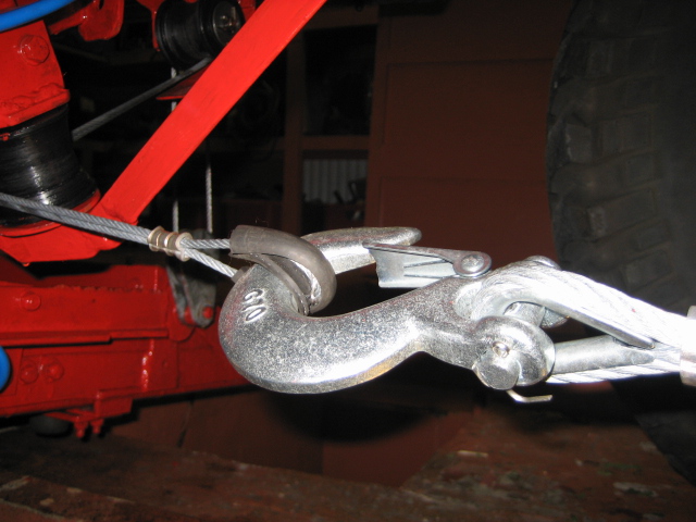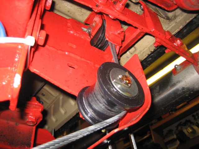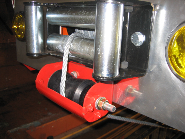biggest change was however replaceing the small winch with a front mounted 13,000lb winch, the pictures show how the whole thing works, the winch cable runs through the fairlead, down round a roller and onto another roller mounted just fore of the axle, here it hooks onto the step cables which in fact is a single cable looped and anchored to the underfloor at each end of the step width, this cable is the smaller 2000lb one and runs through several rollers and pulleys to hook onto the main cable,
