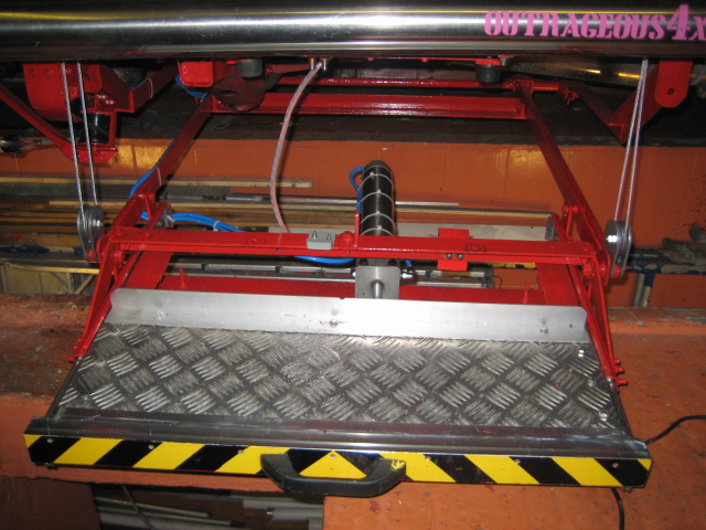 , after two failed goes i think i finally got it right, it's now steady, dosen''t rock and tilt and feels much more stable, lifts my wife (and me but not together)first attempt was a sissor lift type thing and a pair of accuride HD runners fitted verticlally to stop the step folding back under the truck, it was pulled by a small 2000lb winch mounted under the back seat, the result was a wobbly step and although it pulled me up, when i lowered it with me on it it tilted and ball bearing exploded out all over the shop,