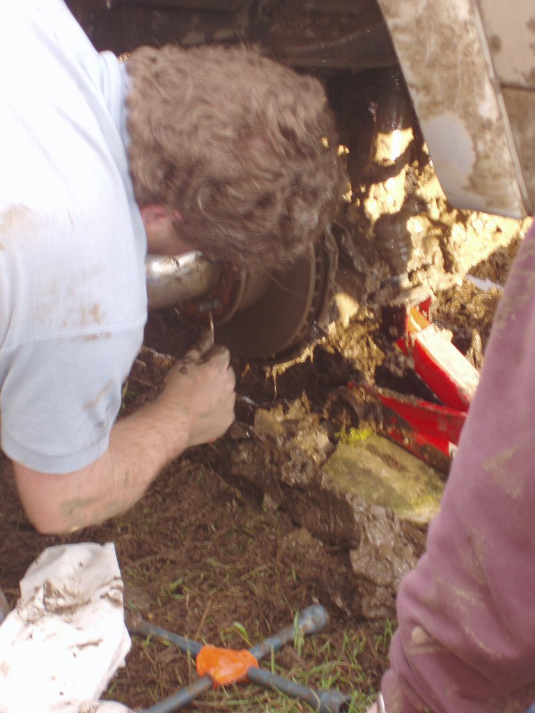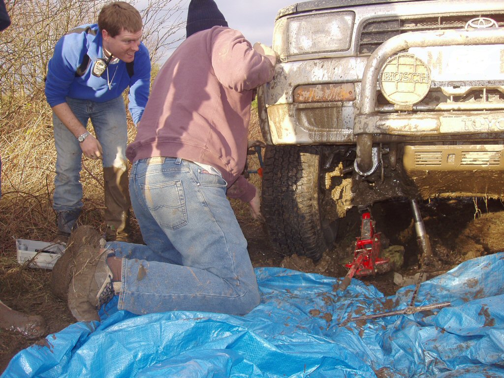 I'll say. The trackrod running right across the two hubs was like a banana. Not the standardised EU variety, the really bendy ones mum used to pack into your lunchbox. Another chance for dad to have a lie-down. This time on a cotton sheet. In the mud! Tied a strop around it and did a bit of modifying with the Range Rover. Anyway, the lad's home safe and parts are on order.